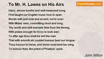 METHOUGHT I saw my late espoused Saint <br /> Brought to me like Alcestis from the grave, <br /> Whom Joves great Son to her glad Husband gave, <br /> Rescu'd from death by force though pale and faint. <br />Mine as whom washt from spot of child-bed taint, <br /> Purification in the old Law did save, <br /> And such, as yet once more I trust to have <br /> Full sight of her in Heaven without restraint, <br />Came vested all in white, pure as her mind: <br /> Her face was vail'd, yet to my fancied sight, <br /> Love, sweetness, goodness, in her person shin'd <br />So clear, as in no face with more delight. <br /> But O as to embrace me she enclin'd <br /> I wak'd, she fled, and day brought back my night.<br /><br />John Milton<br /><br />http://www.poemhunter.com/poem/on-his-deceased-wife/