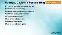LOVE not me for comely grace, <br />For my pleasing eye or face, <br />Nor for any outward part, <br />No, nor for a constant heart: <br /> For these may fail or turn to ill, <br /> So thou and I shall sever: <br />Keep, therefore, a true woman's eye, <br />And love me still but know not why-- <br /> So hast thou the same reason still <br /> To doat upon me ever!<br /><br />Anonymous<br /><br />http://www.poemhunter.com/poem/love-not-me-for-comely-grace-john-wilbye-s-secon/