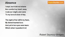 WHEN my love was away, <br />Full three days were not sped, <br />I caught my fancy astray <br />Thinking if she were dead, <br /> <br />And I alone, alone: <br />It seem'd in my misery <br />In all the world was none <br />Ever so lone as I. <br /> <br />I wept; but it did not shame <br />Nor comfort my heart: away <br />I rode as I might, and came <br />To my love at close of day. <br /> <br />The sight of her still'd my fears, <br />My fairest-hearted love: <br />And yet in her eyes were tears: <br />Which when I question'd of, <br /> <br />'O now thou art come,' she cried, <br />''Tis fled: but I thought to-day <br />I never could here abide, <br />If thou wert longer away.'<br /><br />Robert Bridges<br /><br />http://www.poemhunter.com/poem/absence-12/