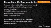 All we were going strong last night this time, <br />the mots were flying & the frozen daiquiris <br />were downing, supine on the floor lay Lise <br />listening to Schubert grievous & sublime, <br />my head was frantic with a following rime: <br />it was a good evening, an evening to please, <br />I kissed her in the kitchen—ecstasies— <br />among so much good we tamped down the crime. <br /> <br />The weather's changing. This morning was cold, <br />as I made for the grove, without expectation, <br />some hundred Sonnets in my pocket, old, <br />to read her if she came. Presently the sun <br />yellowed the pines & my lady came not <br />in blue jeans & a sweater. I sat down & wrote. <br /> <br />Judges xvi.22<br /><br />John Berryman<br /><br />http://www.poemhunter.com/poem/sonnet-117-all-we-were-going-strong/