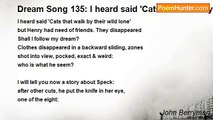 All that hair flashing over the Atlantic, <br />Henry's girl's gone. She'll find Paris a sweet place <br />as many times he did. <br />She's there now, having left yesterday. I held <br />her cousin's hand, all innocence, on the climb to the tower. <br />Her cousin is if possible more beautiful than she is. <br /> <br />All over the world grades are being turned in, <br />and isn't that a truly gloomy thought. <br />It's June, God help us, when the sight we fought <br />clears. One day when I take my sock <br />off the skin will come with it <br /> <br />and I'll run blood, horrible on the floor <br />the streaming blood reminds me of my love. <br />Wolves run in & out <br />take wolves, but terrible enough <br />I am dreaming of my love's hair & all her front teeth are false <br />as were my anti-hopes.<br /><br />John Berryman<br /><br />http://www.poemhunter.com/poem/dream-song-176-all-that-hair-flashing-over/