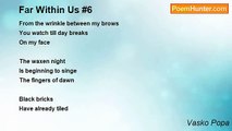 Each strips his own skin <br />Each bares his own constellation <br />Which has never seen the night <br /> <br />Each fills his skin with rocks <br />And plays with it <br />Lit by his own stars <br /> <br />Who doesn't stop till dawn <br />Who doesn't bat an eyelid or fall <br />Earns his own skin <br /> <br />(This game is rarely played)<br /><br />Vasko Popa<br /><br />http://www.poemhunter.com/poem/wedding/
