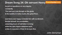Henry of Donnybrook bred like a pig, <br />bred when he was brittle, bred when big, <br />how he's sweating to support them. <br />Which birthday of the brighter darker man, <br />the Goya of the Globe & Blackfriars, whom— <br />our full earth smiled on him <br /> <br />squeezing his old heart with a daughter loose <br />(hostages they áre)—the world's produced, <br />so far, alarms, alarms. <br />Fancy the chill & fatigue four hundred years <br />award a warm one. All we know is ears. <br />My slab lifts up its arms <br /> <br />in a solicitude entire, too late. <br />Of brutal revelry gap your mouth to state: <br />Front back & backside go bare! <br />Cats' blackness, booze,blows, grunts, grand groans. <br />Yo-bad yõm i-oowaled bo v'ha'l lail awmer h're gawber! <br />—Now, now, poor Bones.<br /><br />John Berryman<br /><br />http://www.poemhunter.com/poem/dream-song-97-henry-of-donnybrook-bred-like-a-pi/