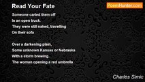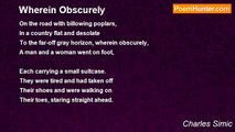 Executioner happy to explain <br />How his wristwatch works <br />As he shadows me on the street. <br />I call him that because he is grim and officious <br />And wears black. <br /> <br />The clock on the church tower <br />Had stopped at five to eleven. <br />The morning newspapers had no date. <br />The gray building on the corner <br />Could've been a state pen, <br /> <br />And then he showed up with his watch, <br />Whose Gothic numerals <br />And the absence of hands <br />He wanted me to understand <br />Right then and there.<br /><br />Charles Simic<br /><br />http://www.poemhunter.com/poem/the-school-of-metaphysics/