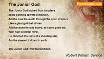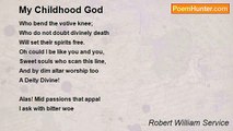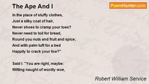 Son put a poser up to me <br />That made me scratch my head: <br />"God made the whole wide world," quoth he; <br />"That's right, my boy," I said. <br />Said son: "He mad the mountains soar, <br />And all the plains lie flat; <br />But Dad, what did he do before <br /> He did all that? <br /> <br />Said I: "Creation was his biz; <br />He set the stars to shine; <br />The sun and moon and all that is <br />Were His unique design. <br />The Cosmos is his concrete thought, <br />The Universe his chore..." <br />Said Son: "I understand, but what <br /> Did He before?" <br /> <br />I gave it up; I could not cope <br />With his enquiring prod, <br />And must admit I've little hope <br />Of understanding God. <br />Indeed I find more to my mind <br />The monkey in the tree <br />In whose crude form Nature defined <br /> Our human destiny. <br /> <br />Thought I: "Why search for Deity <br />In visionary shape? <br />'Twould better be if we could see <br />The angel in the ape. <br />Let mystic seek a God above: <br />Far wiser he who delves, <br />To find in kindliness and love <br /> God in ourselves."<br /><br />Robert William Service<br /><br />http://www.poemhunter.com/poem/the-ape-and-god/
