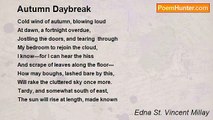 When reeds are dead and a straw to thatch the marshes, <br />And feathered pampas-grass rides into the wind <br />Like aged warriors westward, tragic, thinned <br />Of half their tribe, and over the flattened rushes, <br />Stripped of its secret, open, stark and bleak, <br />Blackens afar the half-forgotten creek,— <br />Then leans on me the weight of the year, and crushes <br />My heart. I know that Beauty must ail and die, <br />And will be born again,—but ah, to see <br />Beauty stiffened, staring up at the sky! <br />Oh, Autumn! Autumn!—What is the Spring to me?<br /><br />Edna St. Vincent Millay<br /><br />http://www.poemhunter.com/poem/the-death-of-autumn/