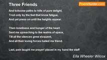 Somewhere I've read a thoughtful mind's reflection: <br /> 'All perfect things are three-fold'; and I know <br />Our love has the rare symbol of perfection; <br /> The brain's response, the warm blood's rapturous glow, <br />The soul's sweet language, silent and unspoken. <br /> All these unite us with a deathless tie. <br />For when our frail, clay tenement is broken, <br /> Our spirits will be lovers still, on high. <br /> <br />My dearest wish, you speak before I word it. <br /> You understand the workings of heart. <br />My soul's thought, breathed where only God has heard it, <br /> You fathom with your strange divining art. <br />And Like a fire, that cheers, and lights, and blesses, <br /> And floods a mansion full of happy heat, <br />So does the subtle warmth of your caresses, <br /> Pervade me with rapture, keen as sweet. <br /> <br />And so sometimes, as you and I together <br /> Exult in all dear love's three-fold delights, <br />I cannot help but vaguely wonder whether <br /> When our free souls attain their spirit heights, <br />E'en if we reach that upper realm where God is, <br /> And find the tales of heavenly glory true, <br />I wonder if we shall not miss our bodies, <br /> And long, at times, for hours on earth we knew. <br /> <br />As now, we sometimes pray to leave our prison <br /> And soar beyond all physical demands, <br />So may we not sigh, when we have arisen, <br /> For just one old-time touch of lips and hands? <br />I know, dear heart, a thought like this seems daring <br /> Concerning God's vast Government above, <br />Yet, even There, I shrink from wholly sparing <br /> One element, from this, our Three-fold Love.<br /><br />Ella Wheeler Wilcox<br /><br />http://www.poemhunter.com/poem/three-fold/