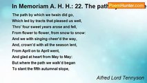 Old Yew, which graspest at the stones <br /> That name the under-lying dead, <br /> Thy fibres net the dreamless head, <br /> Thy roots are wrapt about the bones. <br /> The seasons bring the flower again, <br /> And bring the firstling to the flock; <br /> And in the dusk of thee, the clock <br /> Beats out the little lives of men. <br /> O not for thee the glow, the bloom, <br /> Who changest not in any gale, <br /> Nor branding summer suns avail <br /> To touch thy thousand years of gloom: <br /> <br /> And gazing on thee, sullen tree, <br /> Sick for thy stubborn hardihood, <br /> I seem to fail from out my blood <br /> And grow incorporate into thee.<br /><br />Alfred Lord Tennyson<br /><br />http://www.poemhunter.com/poem/in-memoriam-a-h-h-2-old-yew-which-graspest-at-th/