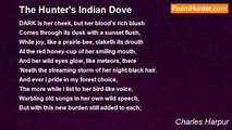 DARK is her cheek, but her blood’s rich blush <br />Comes through its dusk with a sunset flush, <br />While joy, like a prairie-bee, slaketh its drouth <br />At the red honey-cup of her smiling mouth, <br />And her wild eyes glow, like meteors, there <br />’Neath the streaming storm of her night-black hair. <br />And ever I pride in my forest choice, <br />The more while I list to her bird-like voice, <br />Warbling old songs in her own wild speech, <br />But with this new burden still added to each; <br />“Who’ll pity, who’ll comfort the dark wood-dove <br />When the white hawk leaves her to die of love? <br /> <br />O then, by the artless tears that rise <br />’Neath the downcast lids of her gleaming eyes— <br />By the truthfully tender and touching grace <br />That boding passion then lends to her face— <br />I swear, in the very wild spirit of love, <br />Never to leave her, my Indian dove! <br /> <br /><br /><br />Charles Harpur<br /><br />http://www.poemhunter.com/poem/a-hunter-s-indian-dove/