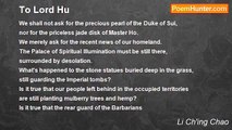 We shall not ask for the precious pearl of the Duke of Sui, <br />nor for the priceless jade disk of Master Ho. <br />We merely ask for the recent news of our homeland. <br />The Palace of Spiritual Illumination must be still there, <br />surrounded by desolation. <br />What's happened to the stone statues buried deep in the grass, <br />still guarding the Imperial tombs? <br />Is it true that our people left behind in the occupied territories <br />are still planting mulberry trees and hemp? <br />Is it true that the rear guard of the Barbarians <br />only patrols the city walls? <br /> <br />This widow's father and grandfather were born in Shantung. <br />Although they never held high office, their fame spread far and wide. <br />I remember when they carried on animated discussions <br />with other scholars by the city gate. <br />The listeners were so crowded that their sweat fell like rain. <br />Their offspring crossed the Yangtze River to the South many years ago. <br />Drifting in the rapids, they mingled with refugees. <br /> <br />I send blood-stained tears to the mountains and rivers of home, <br />And sprinkle a cup of earth on East Mountain. <br />I imagine when Your Lordship, His Majesty's envoy, upholding the Imperial spirit, <br />passes through our two capitals, K'ai Feng and Lo Yang, <br />Thousands of people would line the streets and present tea and broth <br />to welcome you.... <br /> <br />Announce that the Emperor's heart aches for the suffering people--- <br />they are his own children. <br />Let them understand that the Will of Heaven remembers all living beings. <br />Our sagacious Emperor offers his trust which is as brilliant as the sun. <br />There is no need to negotiate many times after the long chaos of the years.<br /><br />Li Ching Chao<br /><br />http://www.poemhunter.com/poem/to-lord-hu/