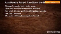 The fragrance of the pink lotus <br />fails, the jade mat hints of autumn. <br />Softly I unfasten my silk cloak, <br />Who is sending a letter from <br />among the clouds? <br />When the swan message returns, <br />the balcony is flooded with moonlight. <br /> <br />The blossoms drift on, the water flows. <br />There is the same yearning of the heart, <br />But it abides in two places. <br />There is no way to drive away this yearning: <br />Driven from the eyebrows, <br />It enters the heart.<br /><br />Li Ching Chao<br /><br />http://www.poemhunter.com/poem/to-the-tune-of/