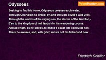 Seeking to find his home, Odysseus crosses each water; <br /> Through Charybdis so dread; ay, and through Scylla's wild yells, <br /> Through the alarms of the raging sea, the alarms of the land too,-- <br /> E'en to the kingdom of hell leads him his wandering course. <br /> And at length, as he sleeps, to Ithaca's coast fate conducts him; <br /> There he awakes, and, with grief, knows not his fatherland now.<br /><br />Friedrich Schiller<br /><br />http://www.poemhunter.com/poem/odysseus-2/