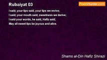 The only vision I have is your sight <br />The only thing I follow is your light. <br />Everyone finds his repose in sleep, <br />Sleep from my eyes has taken flight.<br /><br />Shams al-Din Hafiz Shirazi<br /><br />http://www.poemhunter.com/poem/rubaiyat-01/