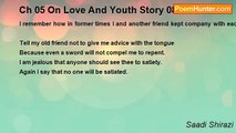 A schoolboy was so perfectly beautiful and sweet-voiced that the teacher, in accordance with human nature, conceived such an affection towards him that’ he often recited the following verses: <br /> <br /> I am not so little occupied with thee, O heavenly face, <br /> That remembrance of myself occurs to my mind. <br /> From thy sight I am unable to withdraw my eyes <br /> Although when I am opposite I may see that an arrow comes. <br /> <br />Once the boy said to him: ‘As thou strivest to direct my studies, direct also my behaviour. If thou perceivest anything reprovable in my conduct, although it may seem approvable to me, inform me thereof that I may endeavour to change it.’ He replied: ‘O boy, make that request to someone else because the eyes with which I look upon thee behold nothing but virtues.’ <br /> <br /> The ill-wishing eye, be it torn out <br /> Sees only defects in his virtue. <br /> But if thou possessest one virtue and seventy faults <br /> A friend sees nothing except that virtue.<br /><br />Saadi Shirazi<br /><br />http://www.poemhunter.com/poem/ch-05-on-love-and-youth-story-05/