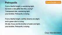 From a fearful height, a wandering light, <br />but does a star glitter like this, crying? <br />Transparent star, wandering light <br />your brother, Petropolis, is dying. <br /> <br />From a fearful height, earthly dreams are alight, <br />and a green star is crying. <br />Oh star, if you are the brother of water and light, <br />your brother, Petropolis, is dying. <br /> <br />A monstrous ship, from a fearful height, <br />is rushing on, spreading its wings, flying. <br />Green star, in beautiful poverty, <br />your brother, Petropolis, is dying. <br /> <br />Transparent spring has broken, above the black Neva’s hiss <br />the wax of immortality is liquefying. <br />Oh if you are star – your city, Petropolis, <br />your brother, Petropolis, is dying.<br /><br />Osip Emilevich Mandelstam<br /><br />http://www.poemhunter.com/poem/petropolis-2/