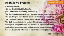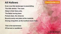 Even now this landscape is assembling. <br />The hills darken. The oxen <br />Sleep in their blue yoke, <br />The fields having been <br />Picked clean, the sheaves <br />Bound evenly and piled at the roadside <br />Among cinquefoil, as the toothed moon rises: <br /> <br />This is the barrenness <br />Of harvest or pestilence <br />And the wife leaning out the window <br />With her hand extended, as in payment, <br />And the seeds <br />Distinct, gold, calling <br />Come here <br />Come here, little one <br /> <br />And the soul creeps out of the tree.<br /><br />Louise Gluck<br /><br />http://www.poemhunter.com/poem/all-hallows/