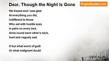 Dear, though the night is gone, <br />Its dream still haunts today, <br />That brought us to a room <br />Cavernous, lofty as <br />A railway terminus, <br />And crowded in that gloom <br />Were beds, and we in one <br />In a far corner lay. <br /> <br />Our whisper woke no clocks, <br />We kissed and I was glad <br />At everything you did, <br />Indifferent to those <br />Who sat with hostile eyes <br />In pairs on every bed, <br />Arms round each other's neck, <br />Inert and vaguely sad. <br /> <br />O but what worm of guilt <br />Or what malignant doubt <br />Am I the victim of, <br />That you then, unabashed, <br />Did what I never wished, <br />Confessed another love; <br />And I, submissive, felt <br />Unwanted and went out?<br /><br />Wystan Hugh Auden<br /><br />http://www.poemhunter.com/poem/dear-though-the-night-is-gone/