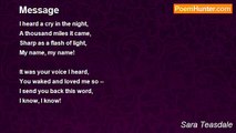 I heard a cry in the night, <br />A thousand miles it came, <br />Sharp as a flash of light, <br />My name, my name! <br /> <br />It was your voice I heard, <br />You waked and loved me so -- <br />I send you back this word, <br />I know, I know!<br /><br />Sara Teasdale<br /><br />http://www.poemhunter.com/poem/message-3/