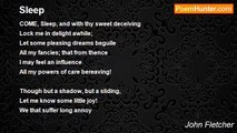Care-charming Sleep, thou easer of all woes, <br /> Brother to Death, sweetly thyself dispose <br /> On this afflicted prince; fall like a cloud <br /> In gentle showers; give nothing that is loud <br /> Or painful to his slumbers; easy, sweet, <br /> And as a purling stream, thou son of Night, <br /> Pass by his troubled senses; sing his pain, <br /> Like hollow murmuring wind or silver rain; <br /> Into this prince gently, oh gently slide, <br /> And kiss him into slumbers like a bride.<br /><br />John Fletcher<br /><br />http://www.poemhunter.com/poem/care-charming-sleep/