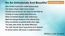 Beautiful landscape! I could look on thee <br />For hours,--unmindful of the storm and strife, <br />And mingled murmurs of tumultuous life. <br />Here, all is still as fair--the stream, the tree, <br />The wood, the sunshine on the bank: no tear <br />No thought of time's swift wing, or closing night <br />Which comes to steal away the long sweet light, <br />No sighs of sad humanity are here. <br /> <br />Here is no tint of mortal change--the day <br />Beneath whose light the dog and peasant-boy <br />Gambol with look, and almost bark, of joy-- <br />Still seems, though centuries have passed, to stay. <br />Then gaze again, that shadowed scenes may teach <br />Lessons of peace and love, beyond all speech.<br /><br />William Lisle Bowles<br /><br />http://www.poemhunter.com/poem/on-a-beautiful-landscape/