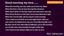When the night becomes romantic <br />When the moon sails in the sky smoothly <br />When the twinkling stars shine in the sky <br />Let my love sleep tight and peacefully <br /> <br />When I talk to you in my dreams <br />When I feel your loving words that echo my ears <br />When memories of the day run through my mind <br />Let my love sleep tight and peacefully <br /> <br />When the angels surround you in the night <br />When the prayers showered on you for blessings <br />When my love express you how much I miss you <br />Let my love sleep tight and peacefully<br /><br />Ravi Sathasivam<br /><br />http://www.poemhunter.com/poem/good-night-my-love/