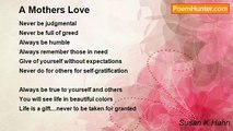 As long as I'm still living <br />You will never be alone <br />My door is always open <br />a place you can call home <br /> <br />No one is perfect nor were we <br />Expected to be <br />You are my children I love you all <br />Unconditionally <br /> <br />I know each of your hearts <br />For they are pure and true <br />Never ever doubt the love I have for you <br /> <br />Each of you are unique <br />In your own special way <br /> <br />So my children I'm here to say <br />Love one another every single day! !<br /><br />Susan K Hahn<br /><br />http://www.poemhunter.com/poem/a-mothers-promise/