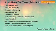Can you believe that it has been nine years? ? ? <br />Since this major disaster took place <br />Things happened unexpectedly <br />A day of pandemonium and disgrace <br />This was no doubt a dark day <br />Where thousands unexpectedly lost their lives <br />Some people fought valiantly to the end <br />But sadly, they would not survive <br />This is a moment that the universe will never forget <br />There was a dark cloud hovering in the sky <br />Nothing but sorrow, grief, pain, and sadness <br />As we witnessed the tragedies right before our very eyes <br />In spite of what has happened <br />America will always stand tall <br />We just have to keep moving our feet <br />We have to find a way to move from behind the wall<br /><br />Ronell Warren Alman<br /><br />http://www.poemhunter.com/poem/it-has-been-nine-years-tribute-to-9-11-01/