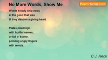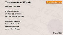 Naive little things, words, <br />yet so effective when strung together <br />breathing romance <br />and fading loneliness <br /> <br />between the lines <br />with words in pastel strokes <br />joined in just the right way. <br /> <br />A writer's thoughts <br />whether fact or fiction <br />become another's hopes, <br />and the words find their way <br />to a reader's heart as surely <br />as petals dropped in a forest <br />mark the way home again. <br /> <br />I love you's bloom, only to fade <br />by truths revealed in even more words. <br /> <br />Can we fall in love through poetry? <br />I believe we can, <br />through the pure naivete of words.<br /><br />C.J. Heck<br /><br />http://www.poemhunter.com/poem/love-in-words/
