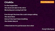 The liar <br />With great desire <br />To have a hair <br />That resembles mine <br />Started when she was nine <br /> <br />But now 20 years later <br />The story is better <br />For she no more wants <br />Any thing that’s mine <br /> <br />She stares at me and looks sad <br />But I am alive not yet dead <br />Got no hair, I am another brand <br /> <br />I got cancer <br />But I seem to be happier <br />Coz my time is much shorter <br />And every day the light gets brighter <br /> <br />June 8,2005<br /><br />Konjit Berhane<br /><br />http://www.poemhunter.com/poem/getting-brighter/