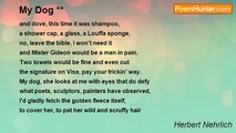 'You seem to have, ' <br />I said to her, sincerely, <br />'Chinese-like eyes <br />when you are fretting, <br />like in pursuit of food, <br />in hopes of being scratched <br />or just to be allowed to watch <br />your favourite show on the TV'. <br /> <br />It was a combination of <br />a hesitation issue twinkle <br />and pupillary sanpaku. <br /> <br />She knows all that, of course <br />and, it is likely that I've been <br />quite tightly wrapped around <br />her paws by Mesmer's eyes.<br /><br />Herbert Nehrlich<br /><br />http://www.poemhunter.com/poem/my-dog-3/