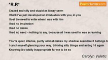 Tuesday nights <br />That is kinda all I know about you <br />We meet up, we chill, we drink (way too much) <br />You tell me stories, about beautiful woman and your travels <br />You indulge my mind with your really attractive arrogance <br />And I feel myself really attracted to this dishonest, underacheiver <br />We decide (or you do) that we will meet and play when we want <br />No strings attached, just mates with natural needs <br />I, m set <br />Why? <br />Should'nt I feel something for this dude? <br />Even a little bit, what does it mean that I don't? <br /> <br />And yet I will sit for hours over analyzing us, and this thing we do <br />When I really know the answer all along <br />And it simply is I, m using you <br />The tables have turned, the double standards are no more mate! <br />I, ll use you, and when I feel like it's time to move on I will <br />Then same thing you would have done, had I given you a chance...............<br /><br />Carolyn Vuletic<br /><br />http://www.poemhunter.com/poem/tuesday-nights/