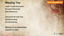 Whisker droppings in the sink, <br />moustache trimmed just so. <br />Spots of water on the mirror, <br />always in a rush to go. <br /> <br />Lazy bubbles on the shower door, <br />toothpaste squeezed in the middle. <br />Trash bags waiting by the door, <br />clothes picked up, just a little. <br /> <br />Seat left up on the toilet <br />like a dragon waiting to bite. <br />Remembering is bittersweet, <br />little flaws have become giant sighs.<br /><br />C.J. Heck<br /><br />http://www.poemhunter.com/poem/missing-him/
