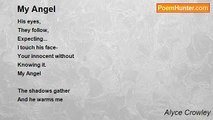 Amber eyes, <br />Like fire somehow crystallized. <br />Magic touch, <br />Gentle smile, <br />Time has brought me this cherished Angel <br /> <br />The road winds behind me, <br />Dark and bloody, <br />I’ve beaten myself until I’ve almost <br />Died, <br />Atoning for the moment <br />When you can love me. <br /> <br />Nothing is what it was, <br />Or will ever be the same again, <br />Because your eyes, <br />Wash away my sin, <br />I find in you the God I’ve looked for <br />And the demon I crave to replace <br /> <br />Amber eyes, <br />Hot like fire, <br />Somehow crystallized, <br />Burn my soul and <br />Purify, <br />The darkness<br /><br />Alyce Crowley<br /><br />http://www.poemhunter.com/poem/your-amber-eyes/