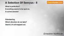 Such aggravation <br />Thorn in the flesh, very painful <br />Need to use tweezers! <br /> <br /> <br />This perpetual flow <br />A waterfall gushing down <br />Never ending story! <br /> <br /> <br />Synchronization <br />A good co-ordination <br />All together now! <br /> <br /> <br />New conversation <br />Chatting away together <br />It's a heart to heart! <br /> <br /> <br />Some apprehension <br />An anxious moment to view <br />I shake in my shoes! <br /> <br />© Ernestine Northover<br /><br />Ernestine Northover<br /><br />http://www.poemhunter.com/poem/a-selection-of-senryus-3/