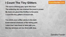 I count the snowflakes as I count your days. <br />The hollows hold evaporated stars. <br />Each one as unique as a poem thought, <br />Bears witness to winter's eternity. <br /> <br />The landscape is the color of old wood. <br />Vividness would disturb its elegance. <br />Within its depth I carve your Slavic face <br />And feel my fingers warmed by memory. <br /> <br />Previously published: Skylark, Purdue University Calumet<br /><br />Sandra Fowler<br /><br />http://www.poemhunter.com/poem/as-i-count-your-days/