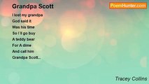 Bruce was my grandpa <br />Really liked when the two of <br />Us went out and had <br />Cake and ice cream <br />Even when it wasn`t my birthday <br /> <br />Climbing around and having a good <br />Old time <br />Laughing and <br />Laughing <br />Into the middle of the <br />Night, then it was time to go to <br />Sleep, and start all over again.<br /><br />Tracey Collins<br /><br />http://www.poemhunter.com/poem/bruce-collins-my-grandpa/
