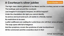 It's very hard to pronounce and the prince's name is Legerdemain. <br />His patchy wallet contains a picture of Madonna and full of rubbish. <br />He is not a cherub it seems. <br />The scars of his wrist a handiwork like tattoos of different handcuffs he wore. <br />His Pidgin English and the moisten heart <br />Does somebody could understand? <br />Then he will be surprised. <br />He is a pickpocket and one day he found his deceased mother's photo <br />In a stolen wallet and he said goodbye to his sorrowful career.<br /><br />nimal dunuhinga<br /><br />http://www.poemhunter.com/poem/a-prince-wasn-t-born-with-a-silver-spoon/