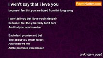 Tell me that you love me <br />Because without your Love <br />I won't be anymore beautiful <br />Because without your love I'm empty <br />And with your love I'm full <br /> <br />Tell me that you love me <br />Because without your love <br />My beauty will never shine <br />Tell me that you love me <br />I want to be sure that you are only mine <br />Tell me that you love me <br />Or just give me any sign <br /> <br />Tell me that you love me <br />Because without your love <br />My beauty I couldn't see <br />And with your love <br />I could swim across the deepest sea <br />With your Love <br />I'll break the chains around me and be free <br />With your love.. I could see <br />How happy with you my life could be? ! <br /> <br />With those three words <br />My life you could change <br />With those three words <br />You can free me from my lonely cage <br />And let me fly & throw off my rage <br /> <br />With those words of love <br />You could make me <br />Escape my kingdom of fears <br />That I've been living in for so many years <br />With those words of love <br />I would shed no tears <br /> <br />Your love supports me to be strong <br />Your love makes me feel that I'm right <br />And all the world is wrong <br />If you just always <br />Tell me that you love me <br />To you I will belong <br /> <br />My love to you <br />I believe it will never die <br />I don't know why? <br />I never give up & always try <br />Because your love makes me <br />Feel so happy.. so high <br />Your love makes me close my eyes <br />And believe I could fly <br />And reach for the sky <br /> <br />I always wish every night at every star <br />That we could be together <br />No matter how we are far <br /> <br />Just tell me that you love me now <br />I know we will be together.. I'm sure <br />I just don't know when or how? <br />But all I know is that my love is pure <br /> <br />5 January 2000<br /><br />unknown poet<br /><br />http://www.poemhunter.com/poem/tell-me-that-you-love-me/