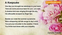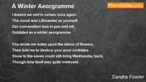 I feel the gray rain falling in my mind. <br />Crying becomes a thousand leaves outlined. <br />My eyes are mesmerized by red sumac. <br />A touch of pewter shines against my back. <br /> <br />The autumn smells of apples in my hair. <br />The smoke of silence strips the light from air. <br />I taste a lemon memory of cold skies. <br />Frost writes your name across my closed eyes. <br /> <br />Copyright, Sandra Fowler,2006<br /><br />Sandra Fowler<br /><br />http://www.poemhunter.com/poem/autumn-is-a-state-of-mind/