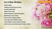 It's in the heart of the grape <br />where that smile lies. <br />It's in the good-bye-bow in the hair <br />where that smile lies. <br />It's in the clerical collar of the dress <br />where that smile lies. <br />What smile? <br />The smile of my seventh year, <br />caught here in the painted photograph. <br /> <br />It's peeling now, age has got it, <br />a kind of cancer of the background <br />and also in the assorted features. <br />It's like a rotten flag <br />or a vegetable from the refrigerator, <br />pocked with mold. <br />I am aging without sound, <br />into darkness, darkness. <br /> <br />Anne, <br />who are you? <br /> <br />I open the vein <br />and my blood rings like roller skates. <br />I open the mouth <br />and my teeth are an angry army. <br />I open the eyes <br />and they go sick like dogs <br />with what they have seen. <br />I open the hair <br />and it falls apart like dust balls. <br />I open the dress <br />and I see a child bent on a toilet seat. <br />I crouch there, sitting dumbly <br />pushing the enemas out like ice cream, <br />letting the whole brown world <br />turn into sweets. <br /> <br />Anne, <br />who are you? <br /> <br />Merely a kid keeping alive.<br /><br />Anne Sexton<br /><br />http://www.poemhunter.com/poem/baby-picture/