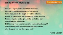 Earth, earth, <br />riding your merry-go-round <br />toward extinction, <br />right to the roots, <br />thickening the oceans like gravy, <br />festering in your caves, <br />you are becoming a latrine. <br />Your trees are twisted chairs. <br />Your flowers moan at their mirrors, <br />and cry for a sun that doesn't wear a mask. <br /> <br />Your clouds wear white, <br />trying to become nuns <br />and say novenas to the sky. <br />The sky is yellow with its jaundice, <br />and its veins spill into the rivers <br />where the fish kneel down <br />to swallow hair and goat's eyes. <br /> <br />All in all, I'd say, <br />the world is strangling. <br />And I, in my bed each night, <br />listen to my twenty shoes <br />converse about it. <br />And the moon, <br />under its dark hood, <br />falls out of the sky each night, <br />with its hungry red mouth <br />to suck at my scars.<br /><br />Anne Sexton<br /><br />http://www.poemhunter.com/poem/as-it-was-written/