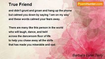 My Best Friend <br />by Barbara Lynn Terry <br /> <br />It was a little over two years ago, <br />I met my best friend, <br />When I was very low, <br />In my self-esteem to no end. <br /> <br />My best friend helped me grow in so many ways, <br />That all through those seemingly endless days, <br />She helped me fight my demons inside, <br />So the world would be a place I could abide. <br /> <br />Without fear, I walk through this world, <br />Proud to be this very girl, <br />I was born to be, <br />For all to see, <br />Because of my best friend, <br />Who will always be til time without end.<br /><br />Barbara Lynn Terry<br /><br />http://www.poemhunter.com/poem/my-best-friend-3/