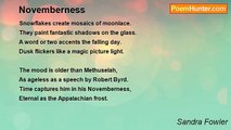 Cold sunshine writes our elegy in frost, <br />Author of light a million snowflakes lost, <br />All gone forever into swirling air, <br />A dance of death that is no longer there. <br /> <br />Pure poetry becomes a stanza said, <br />Classical white a message left unread, <br />While we stand longing for a winter past, <br />Hurt by a mood that was too fey to last. <br /> <br />West is a shadow wrapped around frail bones, <br />Your hand in mine for eloquence atones. <br />Touch is a brevity that needs no sound <br />To turn the weather of the world around.<br /><br />Sandra Fowler<br /><br />http://www.poemhunter.com/poem/an-elegy-in-frost/