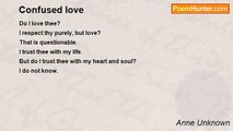 Something’s going on you see <br />I’m going both ways <br />Lost in the strain <br />Which path do I take? <br />Which way do I go? <br />Two choices to make <br />Two paths to take <br />I’m so confused <br />You hold me so close <br />Then you’re with another, <br />Hold my hand the whole way <br />Yet hide it all the same <br />What do you mean doing this to me? <br />I’m so confused <br />I once was yours <br />Now you’re hers <br />I feel all the same <br />You agree, so you say <br />We would kiss in the dark <br />Now we just argue and hark <br />I’m so confused <br />She’s yours now <br />And I’m in the past <br />Yet here I sit <br />Holding your hand? <br />I’m so confused<br /><br />Scarred Unknown<br /><br />http://www.poemhunter.com/poem/confused-36/