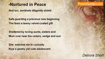 The meadow nourished in softest <br />Sedges scattered amid violet milk weeds <br /> <br />Incredible flowered attractions <br />Hosting dainty butterflies, moths and bees <br /> <br />Each patrol finding warm sunny skie-s <br />Perfumed bliss softly summoning in <br /> <br />These many tiny witnesses for life <br />And too, sentinels diligently shield <br /> <br />Safe-guarding a precious new beginning <br />The fawn a tawny velvet-coated gift <br /> <br />Sheltered by loving aunts, sisters and <br />Mum over near the cedars, sedge and sun <br /> <br />She watches me in curiosity <br />Now a gawky yet cute adolescent <br /> <br />Quietly nibbling crabapples not far from <br />My sacred space on this prayer-filled morn<br /><br />Debora Short<br /><br />http://www.poemhunter.com/poem/nurtured-in-peace-couplets/
