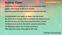 Somebody cares and always will, <br />the world forgets but God loves you still. <br />You cannot go beyond his love, <br />no matter what your guilty of, <br />for God forgives until the end. <br />He is your faithful, loyal friend, <br />and though you try to hide your face. <br /> <br />There is no shelter anyplace that can escape <br />his watchful eyes, <br />for on the earth and in the sky. <br /> <br />He's always present and always there, <br />to take you in his tender care and bind the wounds and mend the breaks. When all the world around forsakes, <br />somebody cares and loves you still and God is the someone who always will.<br /><br />Ashley Sanders<br /><br />http://www.poemhunter.com/poem/somebody-cares/