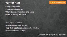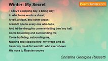 You tell your secret? No, indeed not you; <br />Perhaps some day, you may? <br />But not today; its not May nor gay; no, nay… <br />And you’re too careful: true! <br />I want to hear it! Tell! <br />Only, your secret’s yours, and you won’t spell. <br /> <br />Surely, considering all, there’s some: <br />There must be some secret; after all, <br />Not only just a pun? <br />Today’s a wheezing day, a whooping day; <br />In which one needs a hat, <br />A scarf, a coat and other knits: <br />Will you not ope to one who pleads? <br />Out here the cold come whooshing thro' me raw <br />Come biting and chilling me, <br />Come beating, killing me…. <br />Stinging and piercing thro' my coat and more. <br />I have no mask for warmth: who never feels <br />The pains from winter’s chill <br />Pricked even when the winds are still? <br />You never meant to prick? I thank you in relief. <br />I believe, help my unbelief <br /> <br />Spring’s an exquisite time: yet you don’t trust <br />March with its long dusk, <br />Nor April with its budding sweet showers, <br />Nor even May, when earth’s dullness <br />One bud may soon brighten with the sunlit hours. <br />I pray some splendid summer day, <br />When sprightly birds begin to rest <br />And golden fruits are at their best <br />If there’s just enough sun and enough shade <br />And the cool breeze is neither too soft nor great <br />I Pray! Your secret you will tell <br />For I won’t press.<br /><br />Tay Winston<br /><br />http://www.poemhunter.com/poem/winter-your-secret-christina-georgina-rosetti/
