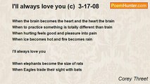 I'll miss the way you looked at me <br />I'll miss the way things we used to be <br />I'll miss the love we used to share <br />and I'll miss the way we used to care <br />I'll miss the way we used to smile <br />and if you were away to see you I'd walk a mile <br />I'll miss all the time I spent with you <br />and trying to explain how green is better than blue <br />I'll miss how I felt when you were in sight <br />and I'll miss the way we used to fight <br />I'll miss the way we knew our love was true <br />and I'll miss how I used to miss you <br /> <br />Copyright 3-20-07 ©® Corey Threet <br /> PLEASE COMMENT!<br /><br />Corey Threet<br /><br />http://www.poemhunter.com/poem/i-ll-miss-c-3-20-07/