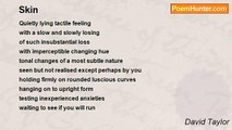 A smooth silent gliding viscous liquid <br />Silently seeping creeping gently downwards <br />Over a sleek and tender surface <br />With no growth left growing anywhere <br />After the apprehensive gritting <br />Of your teeth as the wax goes ripping <br />Waxing is a girly thing with a very manly sting <br /> <br />Sliding, slicing at pulled up roots <br />Glistening stainless steeled with sharpness <br />On the edge it cuts and glides <br />And snags on spots leaving crimson tides <br />After the lavish application of soft soapy lubrication <br />As you tighten skin, the razor goes sliding slashing <br />Shaving is a manly thing with a very girly sting. <br /> <br />Or with a grainy gritness <br />Rubbed with circulating stiffness <br />Of bristled scrubbing brushing briskness <br />To remove half dead particles <br />Of skin not shed by natural deadness <br />Leaving a glowing exfoliated lushness <br />A girly blushness or <br />With too much vigour <br />A manly sore and ruddy redness. <br /> <br />This poem’s just skin deep <br />I know <br />A superficial treatment <br />That cannot cleanse so deep <br />To ever reach <br />Your heart or soul.<br /><br />David Taylor<br /><br />http://www.poemhunter.com/poem/skin-deep-7/