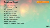 when you look into a soldiers eyes <br />you see the images locked deep inside <br />the torture and hate he has seen <br />the deaths of friends that have been <br />the hard decisions he has made <br />the killing blast of one grenade <br />the countless men he has killed <br />the dangerous missions he has fulfilled <br />the horrific gore <br />the madness of war <br />the deaths of the innocent, their piercing scream <br />now you too wont be able to dream <br />that steely eyed soldier was just a boy <br />untill war took all his joy. <br />so when you meet a soldier with distant eyes <br />think of what he has seen and why he wears that disguise.<br /><br />katie<br /><br />http://www.poemhunter.com/poem/a-soldiers-eyes/